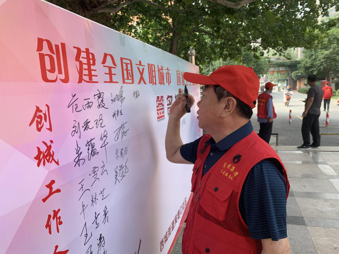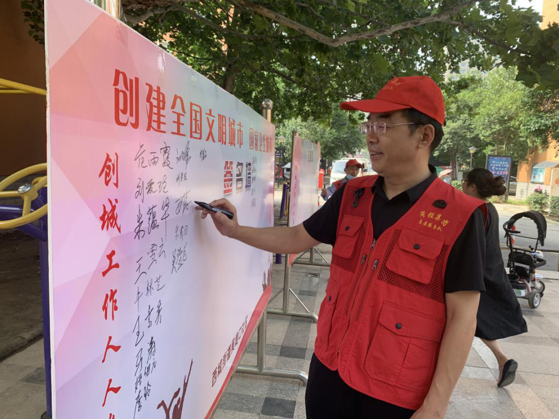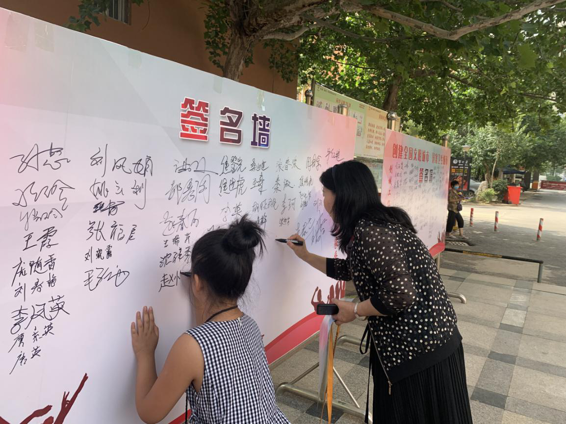 活動現(xiàn)場設置“創(chuàng)建全國文明城市和國家衛(wèi)生城市”主題的簽名墻。居民紛紛在簽名墻上寫下姓名,鄭重承諾為爭做文明市民做表率,以實際行動傳遞心聲,助力創(chuàng)城攻堅。