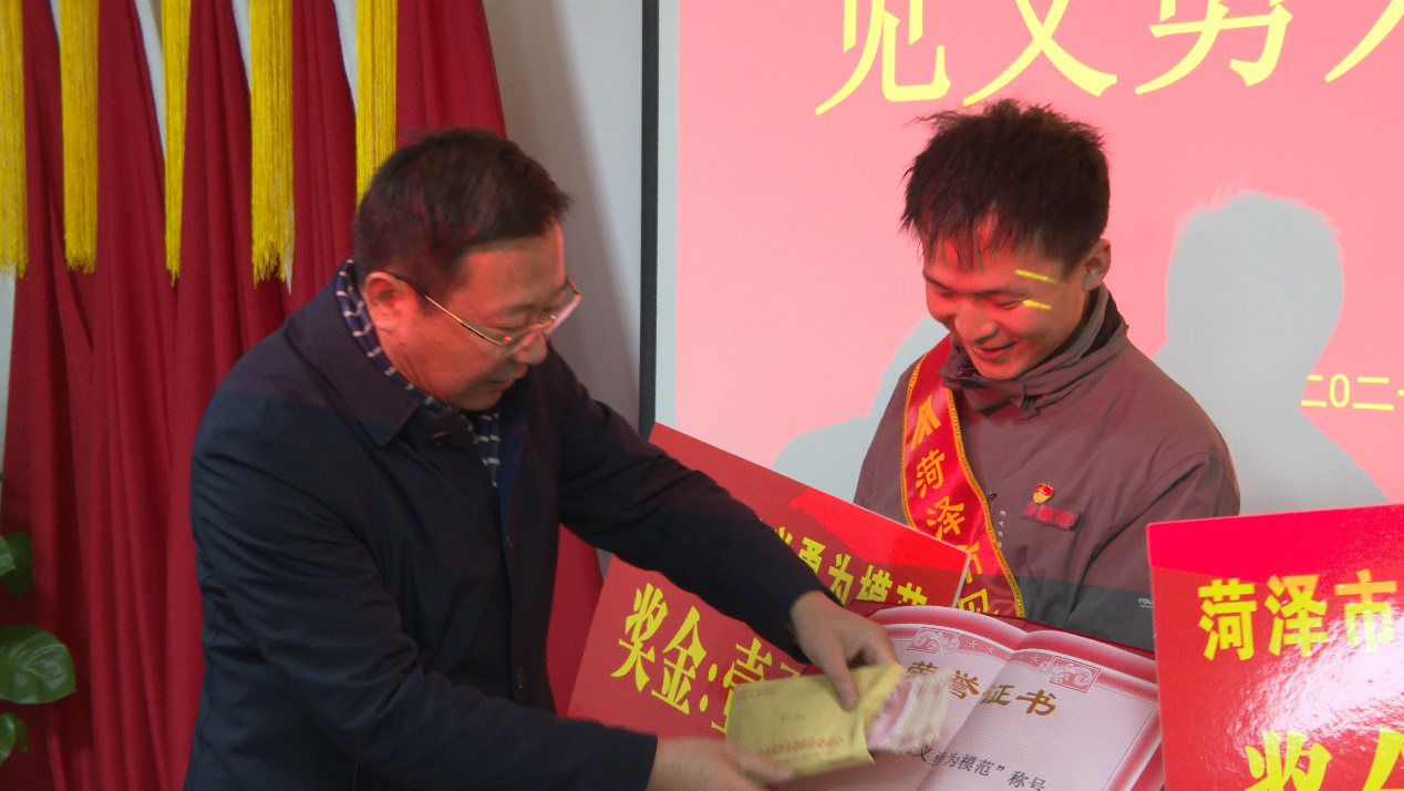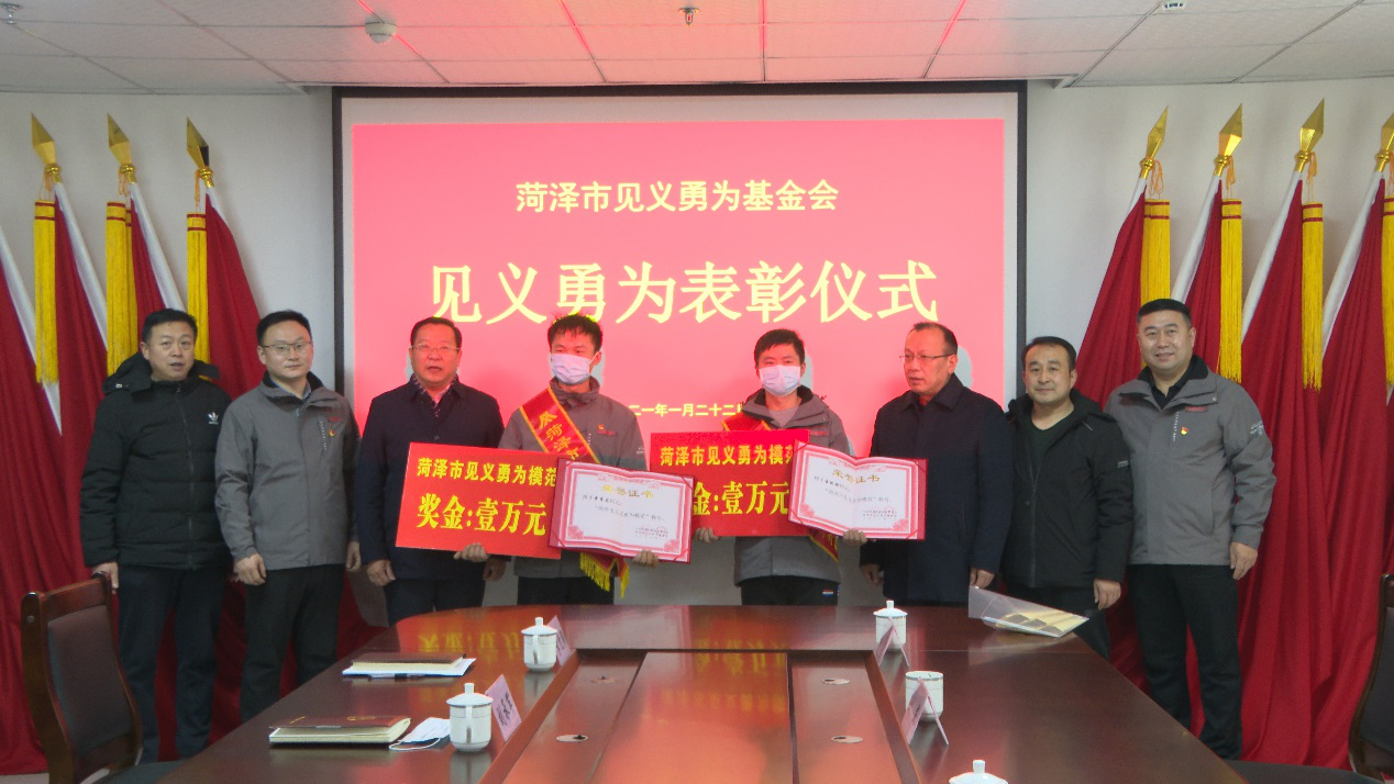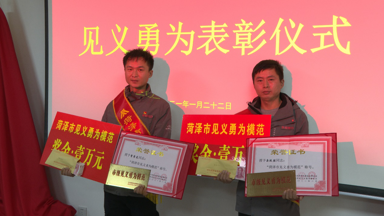 1月22日,菏澤市委政法委副書記李冰一行到菏澤永恒熱力有限公司,將“菏澤市見義勇為模范”榮譽(yù)證書、每人10000元現(xiàn)金見義勇為模范獎(jiǎng)金及榮譽(yù)授帶,送到了賈季龍、岳躍勝手中。