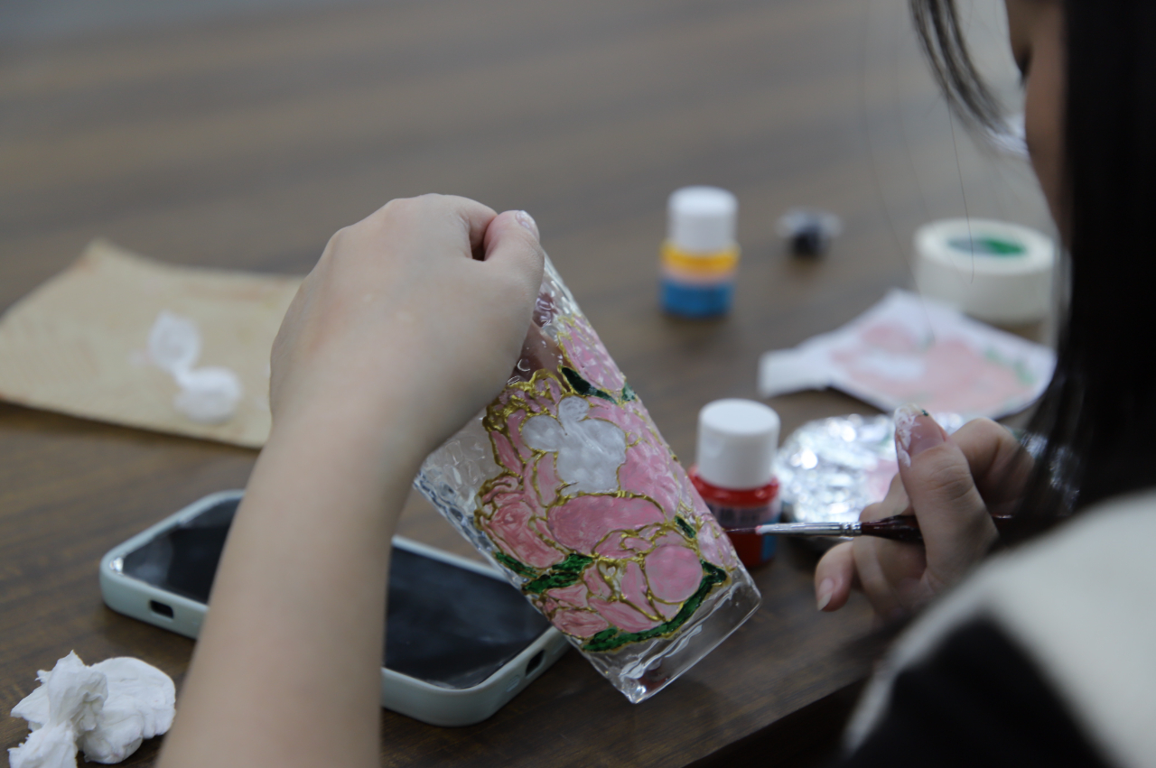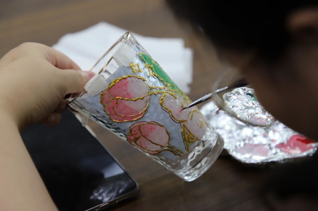 經(jīng)過(guò)一個(gè)多小時(shí)的努力,原本空空如也的玻璃杯開始變得繽紛多彩,一個(gè)個(gè)獨(dú)一無(wú)二的限量款玻璃杯躍然呈現(xiàn)。當(dāng)燈光穿過(guò)彩繪后的玻璃杯,杯影也隨之變得流光溢彩起來(lái)。