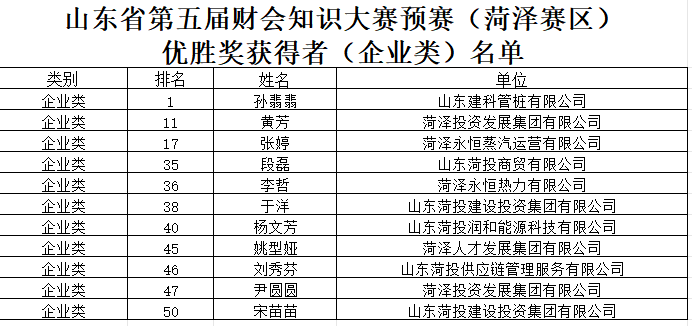 “山東省第五屆財會知識大賽 預(yù)賽(菏澤賽區(qū))”知識競賽近日公布優(yōu)勝獎獲得者和入圍半決賽名單。菏澤投資集團財務(wù)人員孫翡翡入圍半決賽,孫翡翡、黃芳、張婷等11名財務(wù)人員榮獲優(yōu)勝獎。