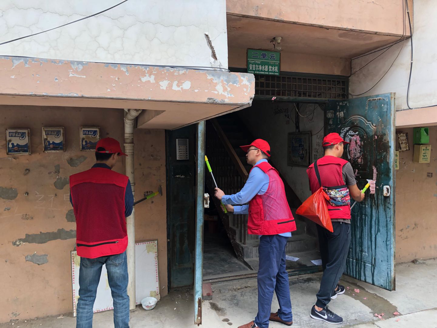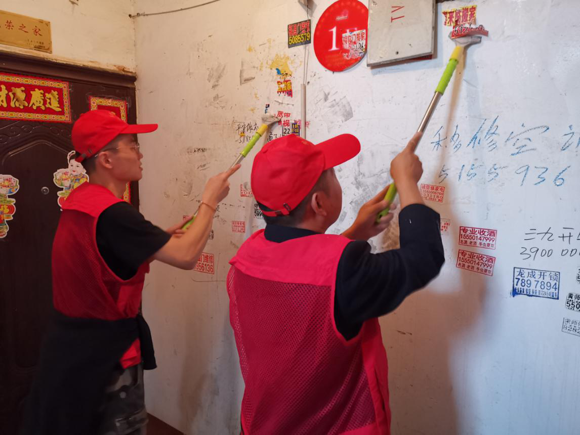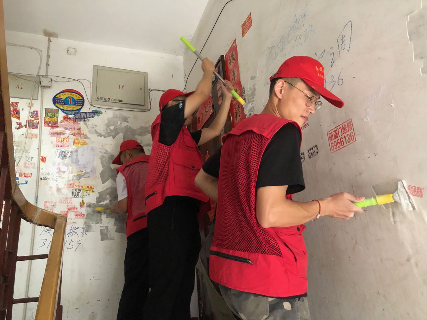 菏投集團志愿者們仔細鏟除小區(qū)內(nèi)墻面上的小廣告