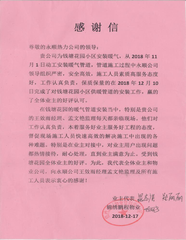 12月18日,公司收到錢塘花園業(yè)主代表及物業(yè)的感謝信,對我公司在錢塘花園小區(qū)熱力管網(wǎng)改造施工過程中認(rèn)真負(fù)責(zé)、熱情周到的工作態(tài)度給予充分肯定和大力贊揚(yáng)。
