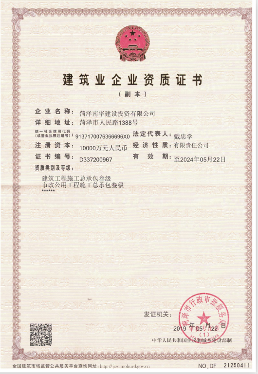 喜報--菏澤南華建設(shè)投資公司正式取得建筑工程、市政工程三級資質(zhì)