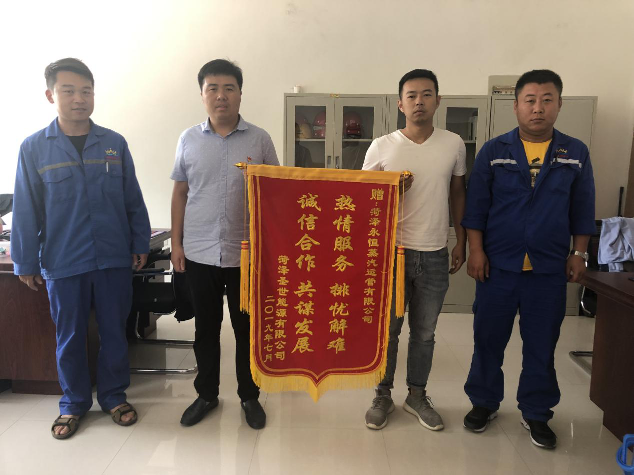 7月3日,菏澤圣世能源有限公司一行三人,專程來到菏澤永恒蒸汽運(yùn)營有限公司,將一面印有“熱情服務(wù) 排憂解難 誠信合作 共謀發(fā)展”的錦旗送到公司工作人員手中,并表達(dá)感謝之情。