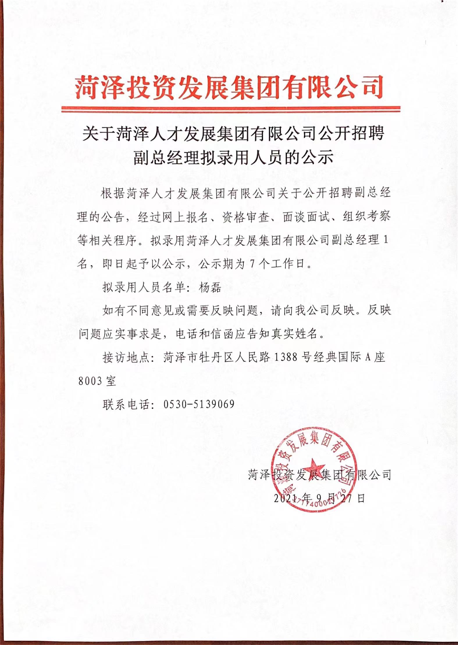 關(guān)于菏澤人才發(fā)展集團有限公司公開招聘副總經(jīng)理擬錄用人員的公示