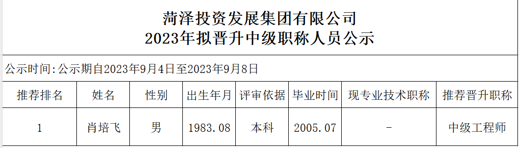 菏澤投資發(fā)展集團(tuán)有限公司2023年擬晉升副高級職稱人員公示