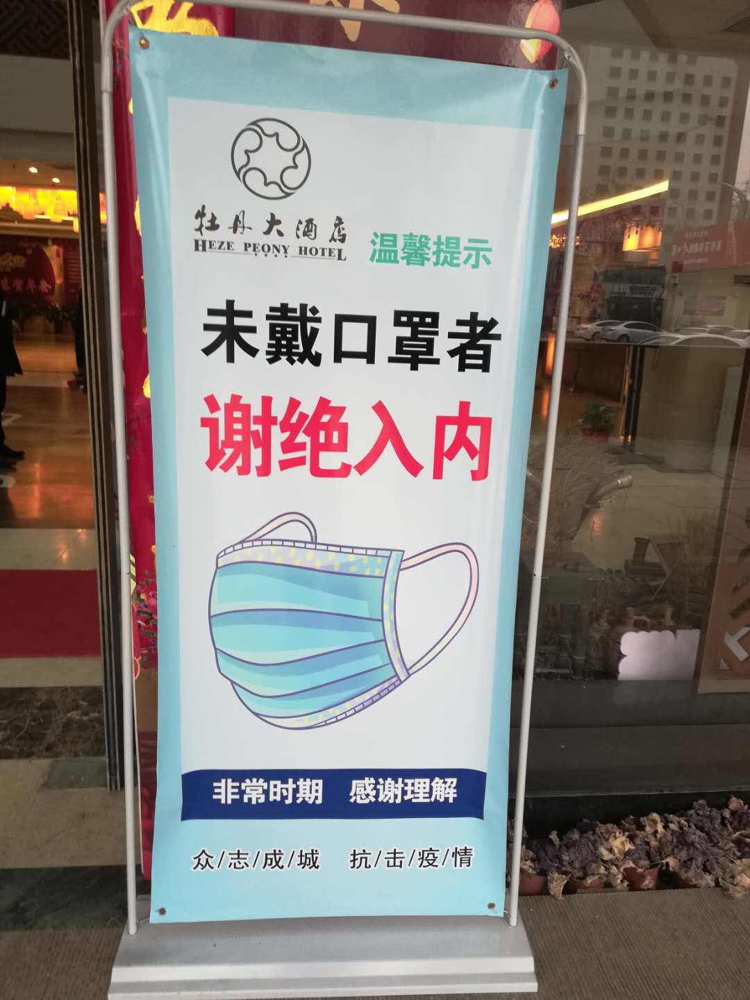 在酒店入口處放置防疫指示牌,提醒客人佩戴口罩,未帶口罩禁止入內(nèi)。