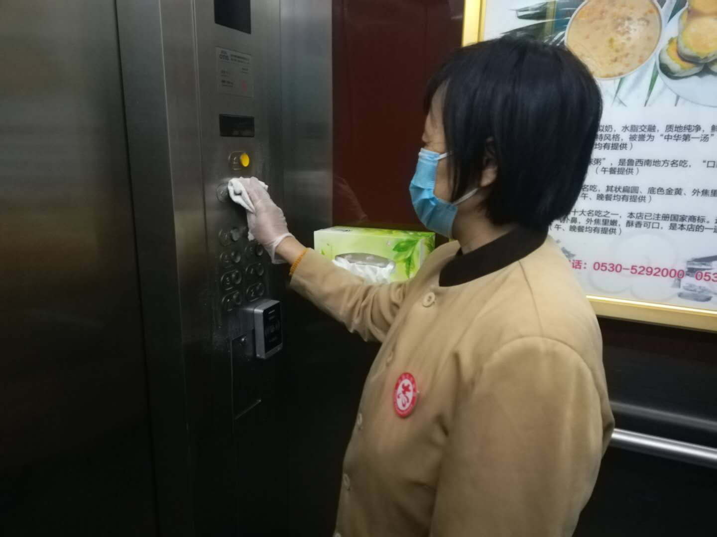 電梯口張貼防疫指示牌提醒顧客乘坐電梯注意事項(xiàng),并安排專人對(duì)電梯、按鍵進(jìn)行消毒。