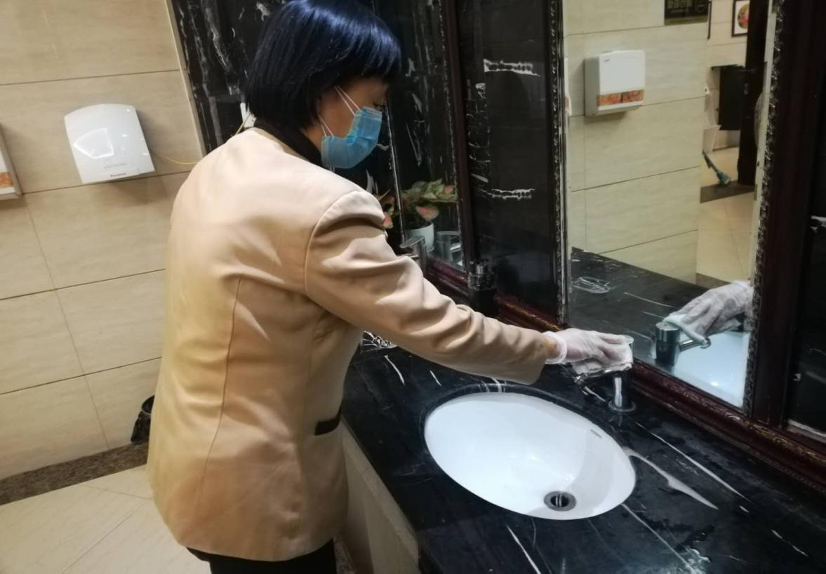 每日安排專人對(duì)大堂、樓道、地面、衛(wèi)生間等公共區(qū)域定期消毒??偱_(tái)對(duì)于客用物品一客一用一消毒。