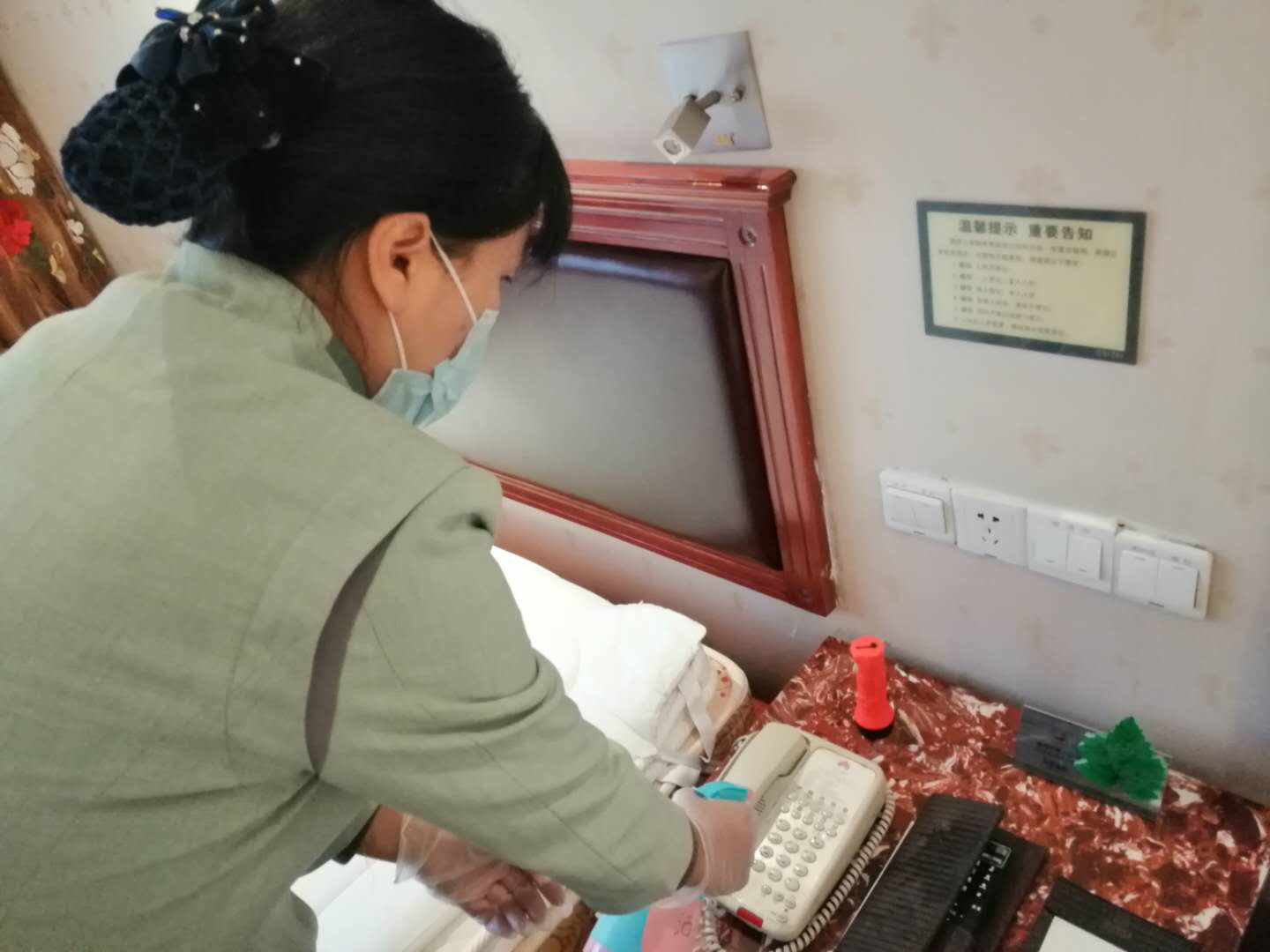 客房部員工用酒精消毒電視遙控器、電話等。